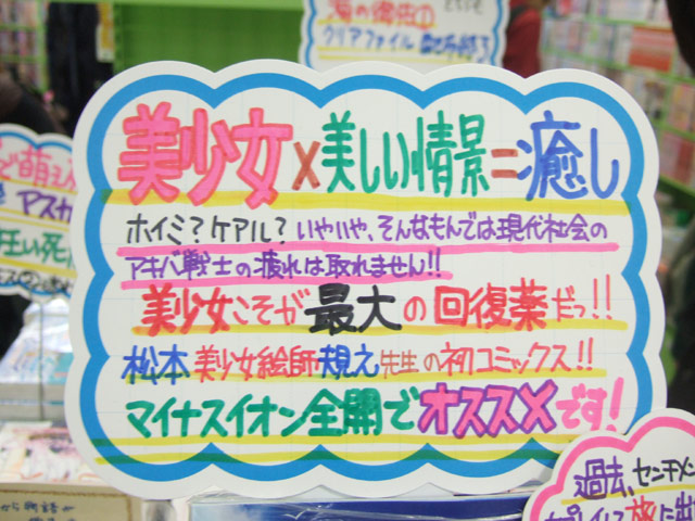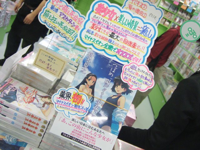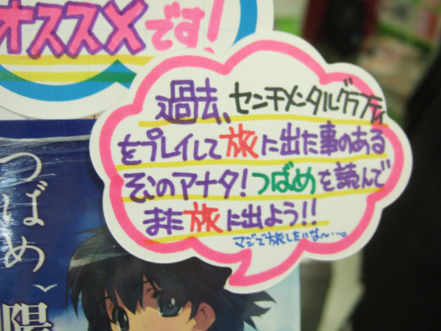 メロンブックスに掲示されていたPOPによると「美少女×美しい情景=癒し ホイミ?ケアル?いやいや、そんなもんでは現代社会のアキバ戦士の疲れは取れません!!美少女こそが最大の回復薬だっ!!松本美少女絵師規之先生の初コミックス!!マイナスイオン全開でオススメです!」「過去、センチメンタルグラフィティをプレイして旅に出た事のあるそこのアナタ!つばめを読んでまた旅に出よう!!マジで旅したいな〜・・・。」とかかれていました。