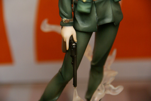 台座は路地の一部をイメージしたもので、手にしたパースエイダー「カノン」の銃口から吹き出る煙の造形も、作風をイメージしたつくりとなっていて、このフィギュア全体のイメージを引き締める役目を果たしていますね〜!