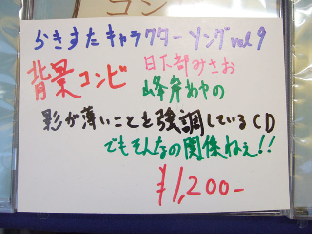 ゲーマーズ本店のPOPでは「背景コンビ 日下部みさお、峰岸あやの影が薄いことを強調しているCD でもそんなの関係ねぇ!!」とかかれていました。