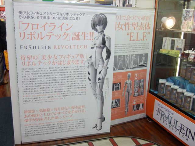 「フロイライン」とは、掲示されていた巨大POPによると「リボルテックにおいて、業界・ユーザー問わず、たくさんのご要望をいただいていた「美少女フィギュア路線」。生身の人間の微妙なラインと、可動のための分割ラインは、もともと相性が良くありません。水着の女の子の肌の上に可動分割ラインが入り、むき出しの関節パーツが露出することには、やはり躊躇を覚えてしまうのです。その違和感を完全に解消する術はありません。我々が送る新シリーズにおいても、残念ながらそれは例外ではありません。ただ、フィギュアの魅力をよりストレートに演出する工夫をし、違和感を軽減してみました。フィギュアの表現力の高さを、いかに殺さずに残すかを考え、リボルバージョイントという優れたパーツを使い、これまでの球体関節フィギュアとは、ほんの少し違う分割方法や可動の可能性を取り入れた、フィギュアの要素を色濃く残した、新しい発想の女性ボディのひな形=「素体」を作り上げ、それをもとに、さまざまなキャラクターを展開していく……。発想を変えたアプローチで展開する、リボルテックの新シリーズが誕生しました。」という、リボルテックの美少女フィギュア版。