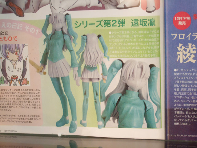 また、シリーズ第2弾は「フェイト 遠坂凜」となるみたいで、掲示されていたPOPによると「上着やスカートが軟質素材で成形されており、ポーズ付けの自由度がアップしている。榎木氏制作による同様の素体『E.L.F.(エルフ)』を基にしながらも、綾波とは異なる分割ラインになっていることなど細部にも注目したい。」とかかれていました。こちらの発売は2008年2月予定となっています。