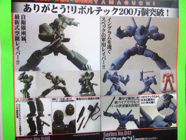 累計個数が200万個を突破したという、海洋堂リボルテックの12月15日発売予定の新作「No.40 ヘルダイバー」(AA)、「No.41 ブロッケン」(AA)、「FC限定 ブロッケン初期OVA版」(AA)3種のサンプル展示がアキバのいくつかのホビーショップで開始しています。これは、どちらも軍用という設定の「機動警察パトレイバー」に登場するメカ「レイバー」を立体化したものです。