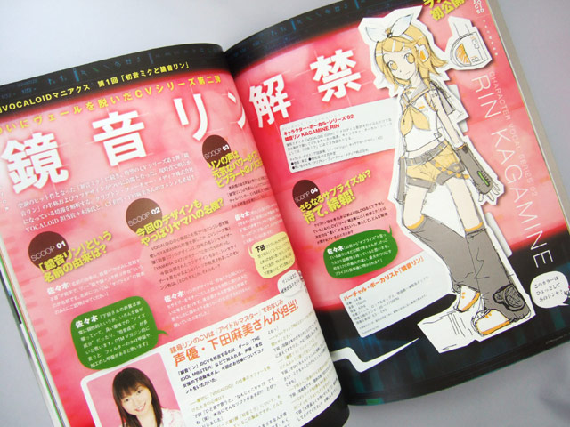 2007年11月号では、初音ミク特集掲載&体験版同梱でしたが、今月号から「初音ミク連載ページ始動!」となっていて、、初音ミクに続く、VOCALOID2第2弾となる、アイマスの「とかち」双海亜美・真美役で知られる下田麻美さんが声を担当された「鏡音リン」のラフイラストなどが公開されています。
