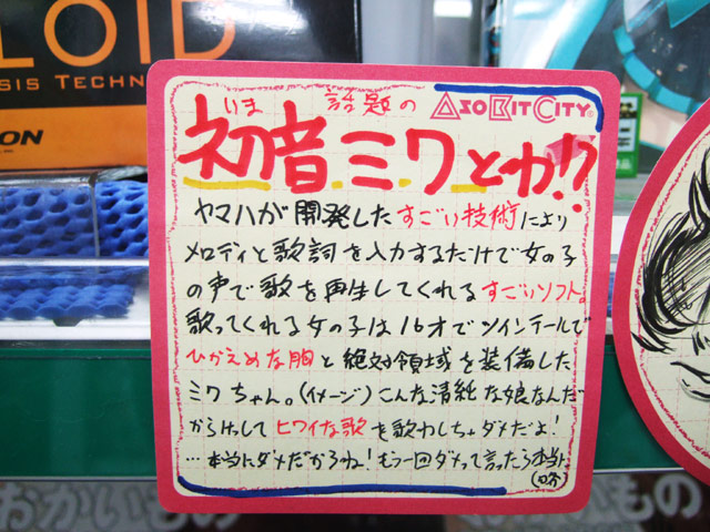 また、掲示されていたPOPでは「話題の初音ミクとか!? ヤマハが開発したすごい技術によりメロディと歌詞を入力するだけで女の子の声で歌を再生してくれるすごいソフト。歌ってくれる女の子は16才でツインテールでひかえめな胸と絶対領域を装備したミクちゃん。(イメージ)こんな清純な娘なんだからけっしてヒワイな歌を歌わしちゃダメだよ!・・・本当にダメだからね!もう一回ダメって言ったら本当に(略)」と紹介されています。