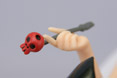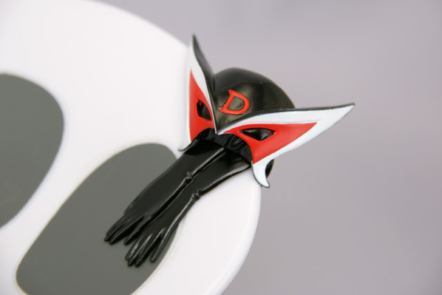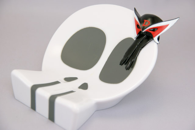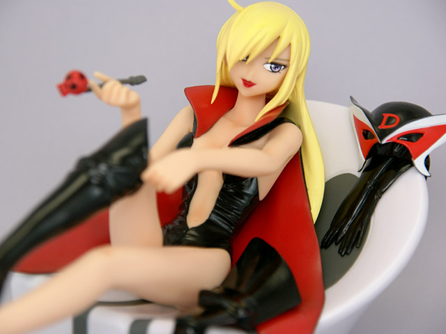 これは、Wikipediaによると「ドロンボーのお色気担当。「ドロンジョ様」「ドロンコ」などの呼称を持ち、金銀宝石を愛するドロンボーの女ボス。本名はササッガワ・ヒロッコ(元ネタは、勿論笹川ひろしであろう)スタイル抜群で頭脳明晰?な美女であるが、本シリーズ歴代女ボスの中でも最も特徴ある大きなフード型の仮面を被っており、素顔は平時の悪徳商売中くらいしか(ただし、ストーリー初期。中期からはペルソナを着用)見られない。フライドポテトが大好き。ドロンボーが解散するということになった際、ボヤッキーとトンズラーに、「いい女は振り返らないものなんだよ。」と涙ながらに発言していた。ある大会社の令嬢らしい。ネーミングモデルは、フランスの女優で小原の持ち役でもあるミレーヌ・ドモンジョから由来している。24歳。(CV:小原乃梨子さん)」という、ドロンジョ様をどくろ椅子に腰掛けくつろいだ姿で立体化したものです。