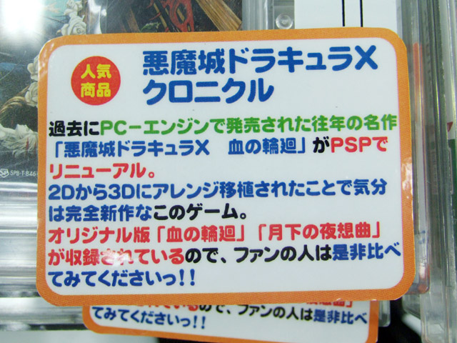 ソフマップアミューズメント館の解説POPによると『人気商品 悪魔城ドラキュラXクロニクル 過去にPC-エンジンで発売された往年の名作「悪魔城ドラキュラX 血の輪廻」がPSPでリニューアル。2Dから3Dにアレンジ移植された事で気分は完全新作なこのゲーム。オリジナル版「血の輪廻」「月下の夜想曲」が収録されているので、ファンの人は是非比べてみてくださいっ!!』と紹介されています。
