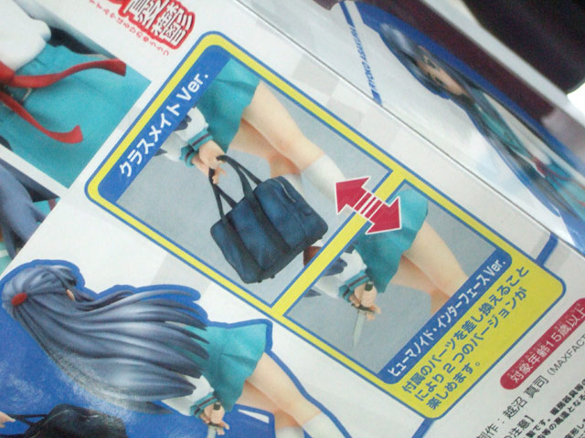 これは、以前、キャラホビ2007でのサンプル展示もお伝えした、「涼宮ハルヒの憂鬱」の「朝倉涼子」を立体化したもので、マックスファクトリーの商品説明によると『涼宮ハルヒの憂鬱フィギュアシリーズに、「朝倉涼子」が登場です。美人で人当たりの良い優等生としてのイメージを、バッグを持った通学風景で立体化しました。柔らかな印象の笑顔に、健康的なフトモモが魅力的。さらにパーツを付け変えることで、通学スタイルからファンにはおなじみのナイフを持った姿に変化!同じ笑顔も危険なものに見えてきます・・・。「クラスメイトVer.」と「ヒューマノイド・インターフェースVer.」、2つのバージョンをお楽しみください。』と紹介されています。