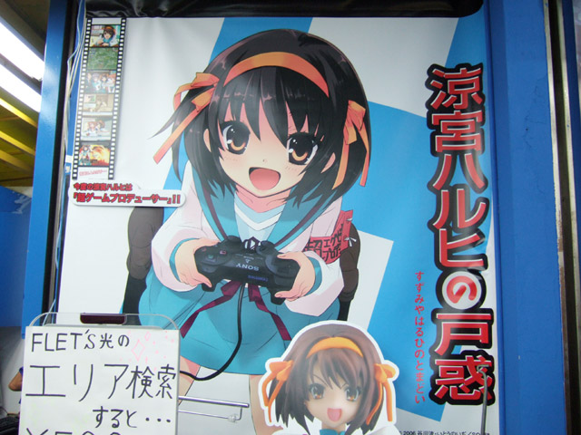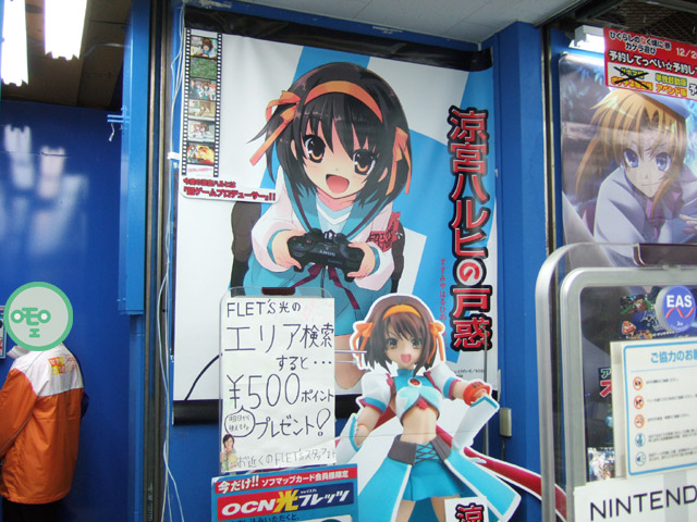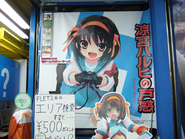 ソフマップアミューズメント館の店頭では、超限定版の予約数が5万本を突破したらしい、バンプレスト「涼宮ハルヒの戸惑」(AA)のハルヒがPS2をプレイしている巨大イラストが掲示されています。