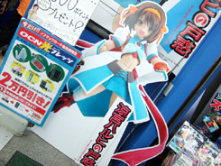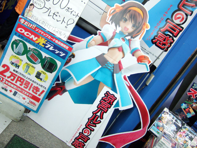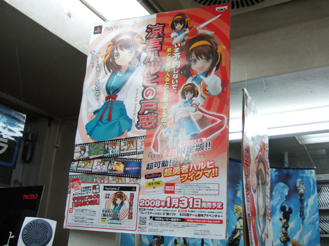 ソフマップアミューズメント館の店頭に、超限定版の予約数が5万本突破したらしい、バンプレスト「涼宮ハルヒの戸惑」(AA)のハルヒがPS2をプレイしている巨大イラストが掲示されています。その下には「超限定版」(AA)に付属のfigmaの「超勇者ハルヒ」(参考サンプル)を等身大?にまで引き伸ばしたスタンドPOPが。他、アキバで見かけた「涼宮ハルヒの約束」(AA)のPOPなど。