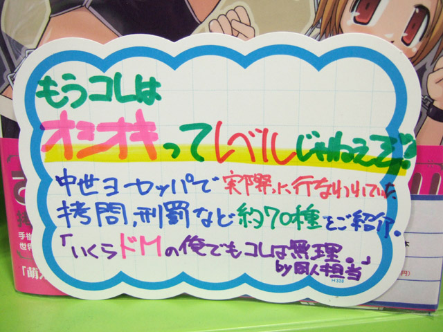 アットプレスおしおき娘大全集」(AA)が11月12日には発売となっていました。これは、商品説明によると、「いたずらッコに素敵なおしおきを☆〜世界中から選りすぐった「拷問」「刑罰」「処刑」を有名絵師による萌えイラストで解説!」というもの。「鉄の処女」や「串刺し」等DEATH系もはいっていることからか、メロンブックスのPOPでは、「いくらドMの俺でもコレは無理。」とのことw