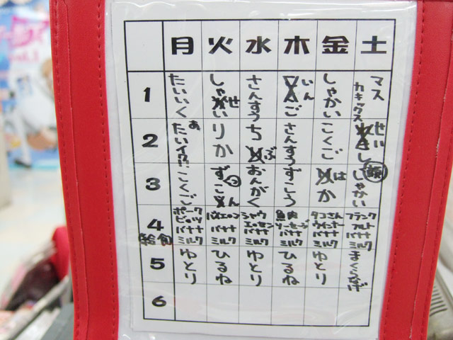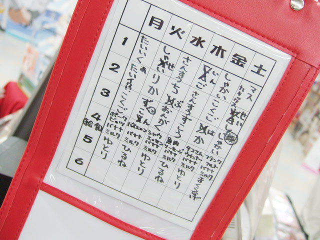 ゲームシティで展示されている、DVD「こどものじかん 1科目」(AA)の初回版に付属予定の「全巻収納式ランドセル型DVD-BOX」のふたが開いているのに気がついたのでめくってみたところ、中に予約シートがおかれ、時間割も書かれていました。その時間割には「(顔)しゃかい」とか「れきせいし」とか、「ず(っ)こうん」とかw あとお昼は毎日ウインナーとバナナとミルクみたいw