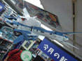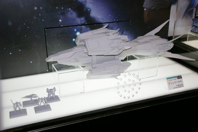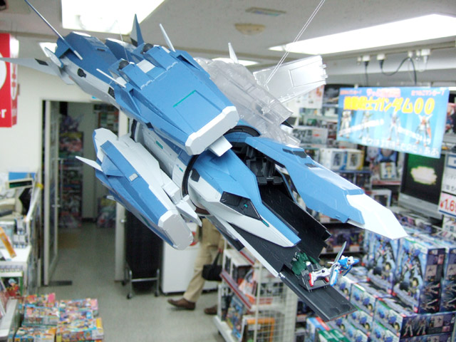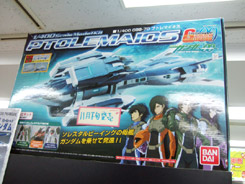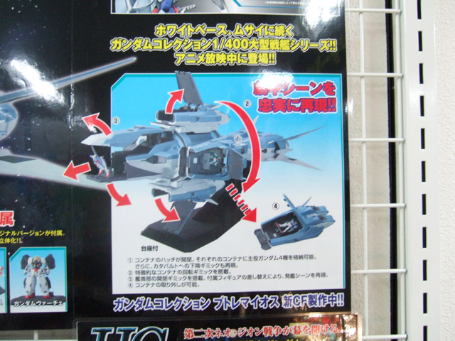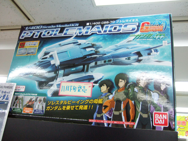 これは、キャラホビ2007でサンプル展示もあった、アニメ「機動戦士ガンダム00」の主人公などが搭乗する4機のガンダムからGN粒子をもらって稼動する戦艦という、「プトレマイオス」を1/400スケールで立体化したもので、Amazonの商品説明によると『ガンダムコレクション1/400大型戦艦シリーズに機動戦士ガンダム00のソレスタルビーイングの母艦「プトレマイオス」が登場!全長650mm。彩色済み、組み立てキット。主役ガンダム4機を格納する4つのコンテナの回転&取り外しギミックにより、劇中シーンを再現!艦首の開閉とカタパルトへのフィギュア差し替えにより、ガンダムの発着艦シーンを再現!主役のフィギュア付属!エクシア・デュナメス・キュリオス(飛行形態)・ヴァーチェの4体。』と紹介されています。(掲示されていたPOP解説)