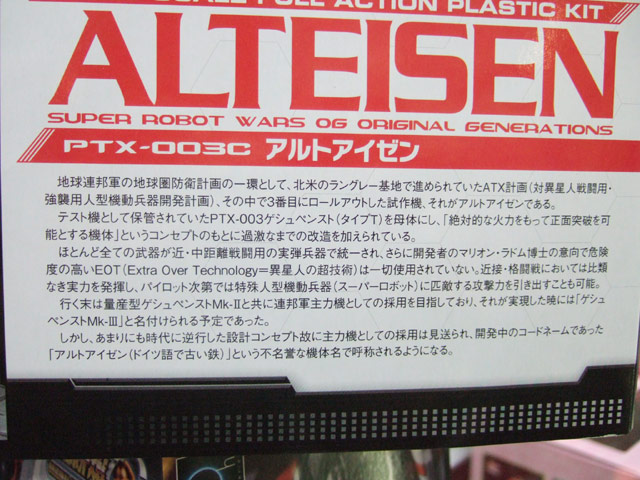 ゲームソフト『スーパーロボット大戦 ORIGINAL GENERATIONS』、アルトアイゼンのプラスチックキット。開田裕治による描き下ろしイラストパッケージ。全高約170mm。パーツ数はプラ197、ポリ36。ポリキャップ使用によるフル可動キット、5色のマルチカラーキット。一部彩色パーツ導入で素組みでもほぼ設定どおりの仕上がりに。スクエア・クレイモアの展開や、リボルビング・ステークの再装填機構もパーツの差し替えなしで再現可能。ランナー毎に細かく色分けされたマルチカラーキットでより手軽に楽しむことができる。1/100スケールだけの新構想による可動設計で腰部分のスイングを含めた各種間接により、ダイナミックなアクションポーズが再現可能に!また、コックピットの開閉、スクエア・クレイモアのよりリアルな展開ギミック、カメラアイの発光ギミックを完備したアルトアイゼン。
