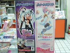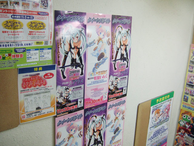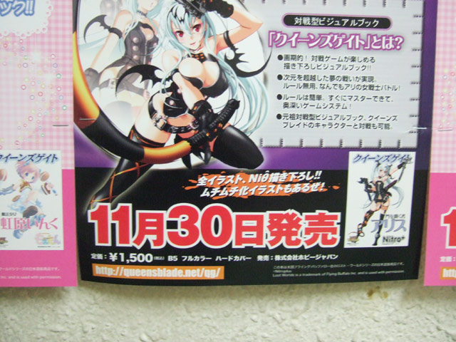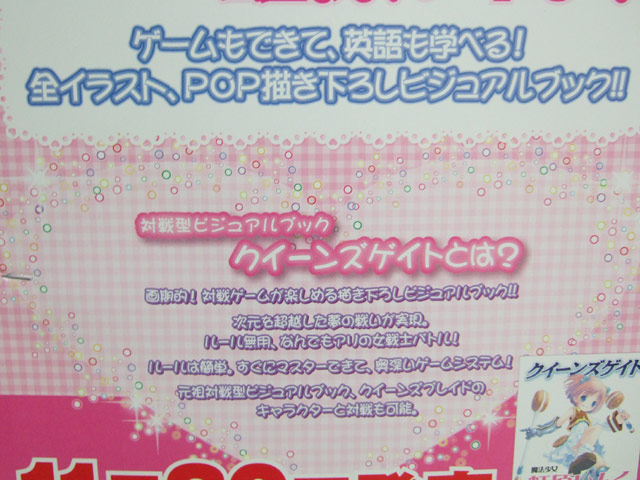ゲーマーズ本店等で、「クイーンズブレイドの”対戦型ビジュアルブック”フォーマットそのままに様々なブランドのキャラクターが登場する、コラボシリーズ」という、「クイーンズゲイト」の第1弾「門を開く者 アリス」(AA)と「魔法少女 虹原いんく」(AA)の告知POPが展開されていました。「門を開く者 アリス」(AA)はムチムチ化も出来るみたいで、POPにはその変身過程イラストも掲載。