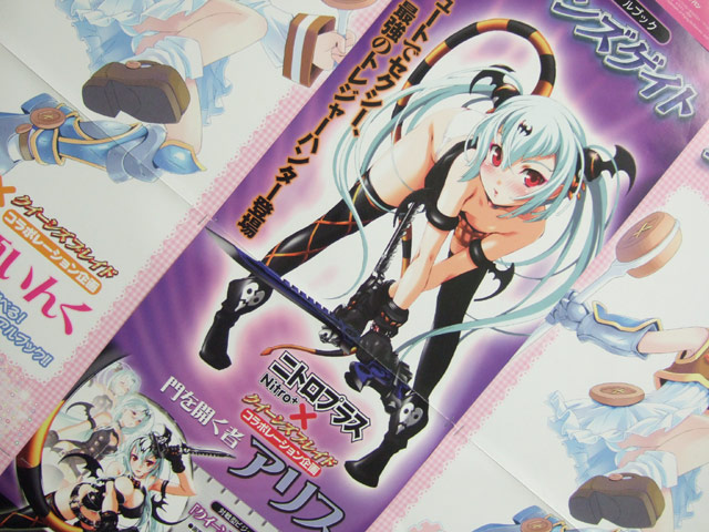 こちらはニトロプラスとのコラボとなる、「クイーンズゲイト 門を開く者 アリス」(AA)のPOP全体と掲載イラストの一部など。