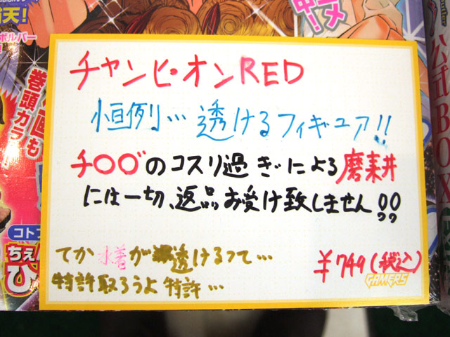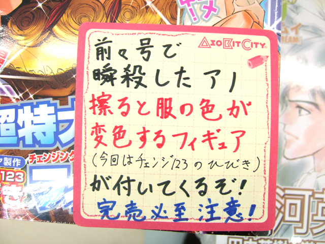 他、19日に入荷確認できたのは、K-BOOKS、メロンブックス、「前々号で瞬殺したアノ擦ると服の色が変色するフィギュア(今回はチェンジ123のひびき)が付いてくるぞ!完売必至注意!」とされたゲームシティ、「大丈夫!こんかいの付録も水着がすけるから安心してネ★」とされたとらのあな1号店等でした。