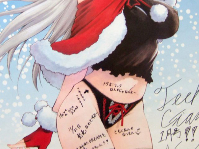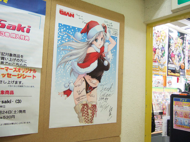 TECH GIAN 2008年 1月号」(AA)の表紙イラストを用いた告知ポスターがゲーマーズ本店にて掲示されていました。イラストはにしき義統氏の描かれた「スカートはいてない」女の子サンタで、ポスターに書かれた解説(?)によると「さむそ〜とか言うな!! 今年の冬モノはやっぱこれだね♥ サンタ下着だよ〜 もしくは下着サンタ?」とのこと。他、おへそや太ももにも解説(?)がw