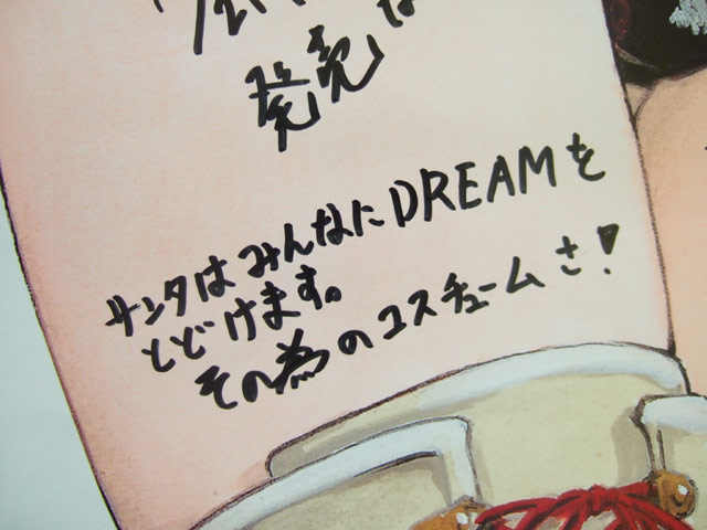 その解説(?)によると、「サンタはみんなにDREAMをとどけます。その為のコスチュームさ!」「さむくなんかないもん」「このラインこのライン」「メタボリックなんかじゃないよ〜」等と書かれ、サンタ下着、もしくは下着サンタさんの良さを力説している感じでしたw
