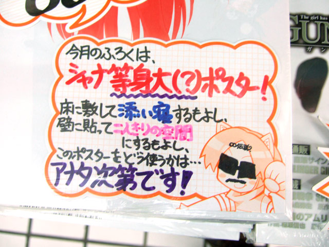 とらのあな1号店のPOPによると「床に敷いて添い寝するもよし、壁に貼って二人きりの空間にするもよし、このポスターをどう使うかは・・・アナタ次第です!」という、「シャナ等身大BIGポスター」が付属。