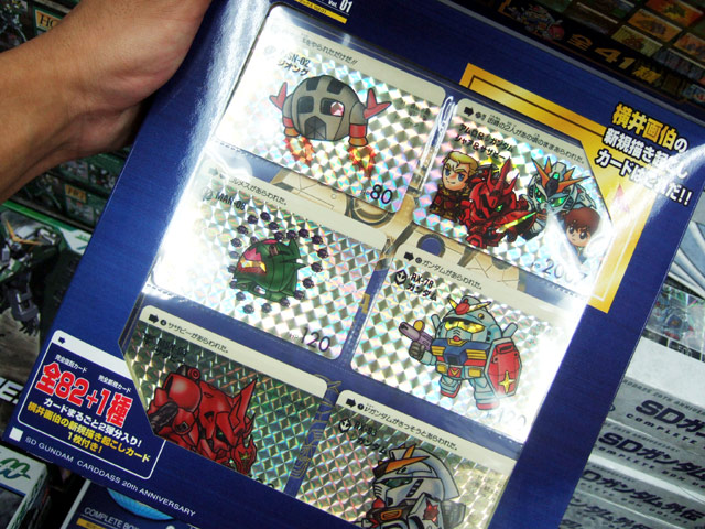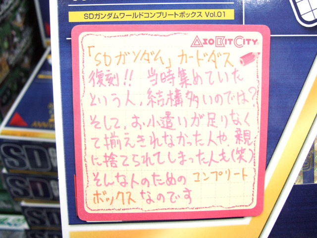 キャラシティのPOPによると、『「SDガンダム」カードダス復刻!!当時集めていたという人、結構多いのでは?そして、お小遣いが足りなくて揃えきれなかった人や、親に捨てられてしまった人も(笑)そんな人のためのコンプリートボックスなのです』とかかれていました。