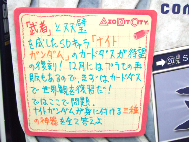 キャラシティのPOPによると、『「武者」と双璧を成したSDキャラ「ナイトガンダム」のカードダスが待望の復刻!12月にはプラモの再販もあるので、まずはカードダスで世界観を復習だ!ではここで問題。ナイトガンダムが身に付ける三種の神器を全て答えよ」と書かれていました。