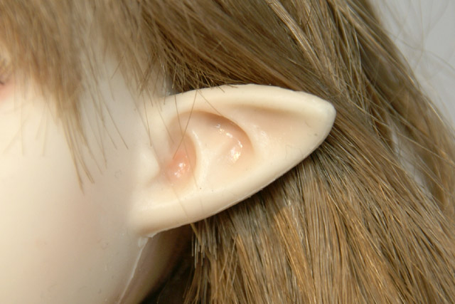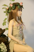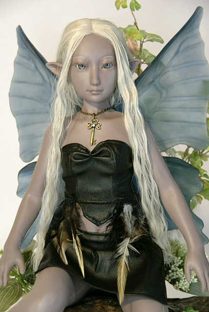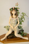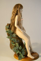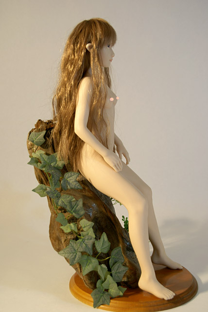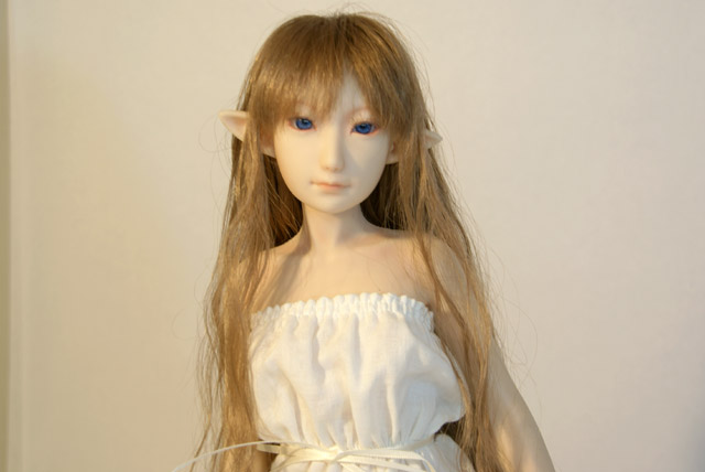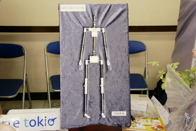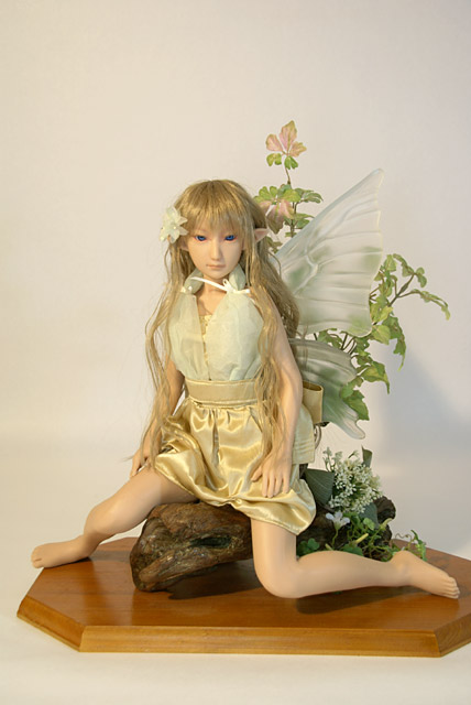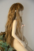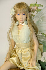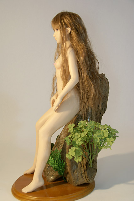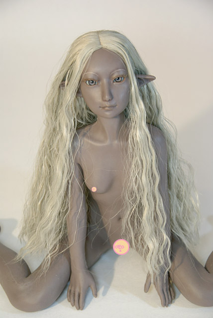 これは、以前WHF横浜DASH2での展示の様子をお伝えしたこともある、「ケルトの伝説に存在する妖精」の「sidh(シー)」をモチーフにし、金属、プラスチックによる55パーツ構成の骨格を用いた、全高50cmのシームレスボディ(間接部分の露出しない柔らか素材のボディ)のシリコン製ドールで、アルテトキオの商品説明によると「ボディの材質はドイツ製の医療用シリコーンエラストマーです。これは付加タイプのシリコーンエラストマーで材質的に安定性があり長期にわたり型くずれが起きにくいものです。」「骨格は金属(SS41)、プラスチック(ウレタンキャスト)による55のパーツ構成で、28自由度を実現しました。これにより人間のとる自然なポーズに近い可動範囲が得られます。ただしシリコーンエラストマーは極端な引き伸ばしには耐えられないので骨格の限界とボディ自体の限界は別物とご理解ください。」「ヘッドはM3サイズのネジ(長さ40mm)で簡単に取り外しが出来ます。もちろんシリーズ化し次第交換が可能です。またウィッグはSサイズのものであれば様々なタイプの髪型に交換して楽しめます。」と紹介されています。