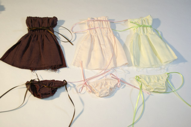 こちらは、素体セットに付属の衣装の色違いとなる、右からボルドー、ピンク、ミントグリーンの「草原の服」です。