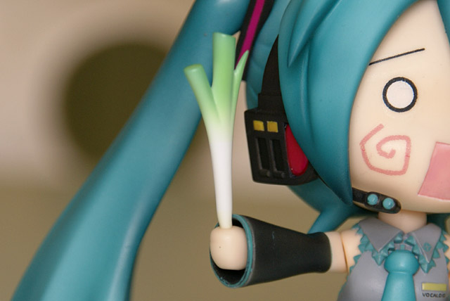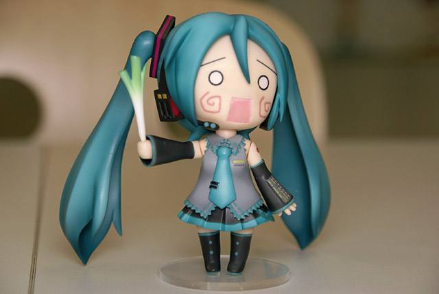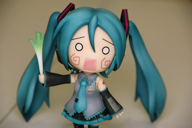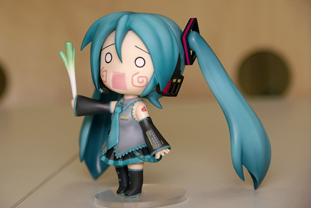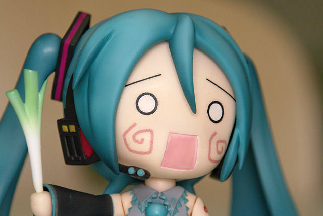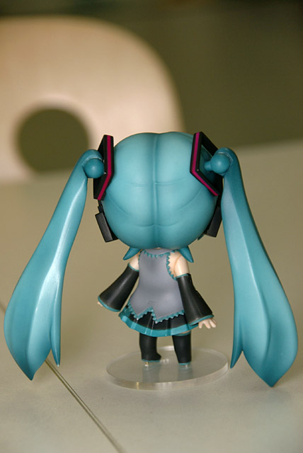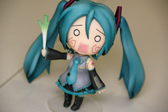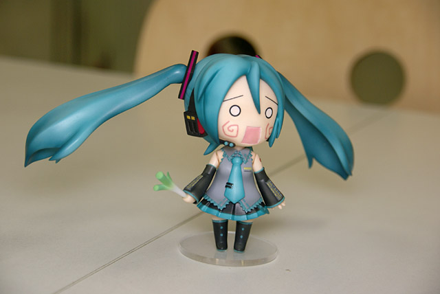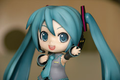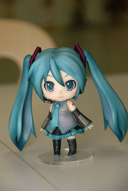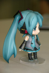 これは、電撃15年祭でもサンプル展示のあった、クリプトンのDTMソフト「VOCALOID2 初音ミク」(RA)をねんどろいどにしたもので、グッスマの商品説明によると『バーチャル・シンガーがリアルに癒しをお届けします。いま巷で人気爆発中!!『キャラクター・ボーカル・シリーズ01 初音ミク』から、イメージキャラクター「初音ミク」がねんどろいどになって登場です!公式イラストのイメージをギュッと凝縮して可愛らしくねんどろいど化。表情、手足のパーツを付け替えれば、歌っている姿も表現可能です。さらにっ、まさかの「はちゅねミクVer.」の表情も付属!!おなじみのネギを持つ姿は、ファンには垂涎モノです。』と紹介されています。