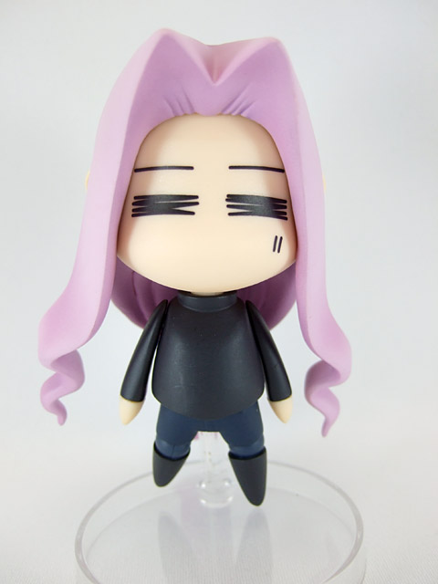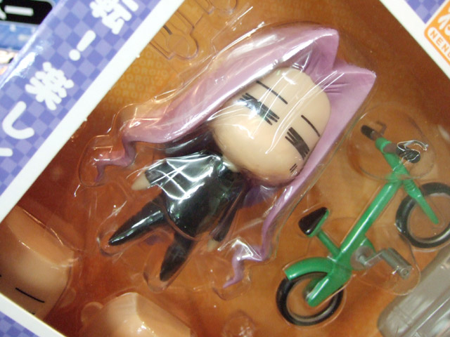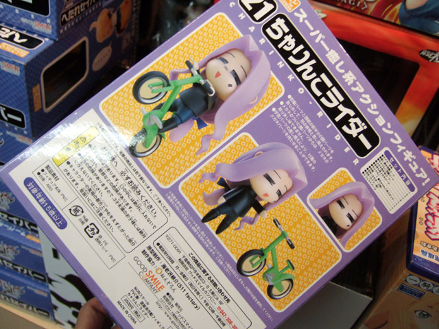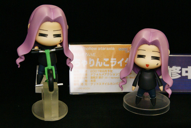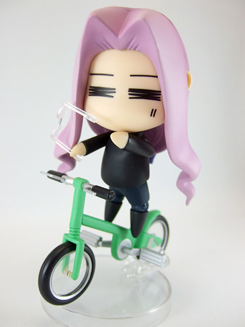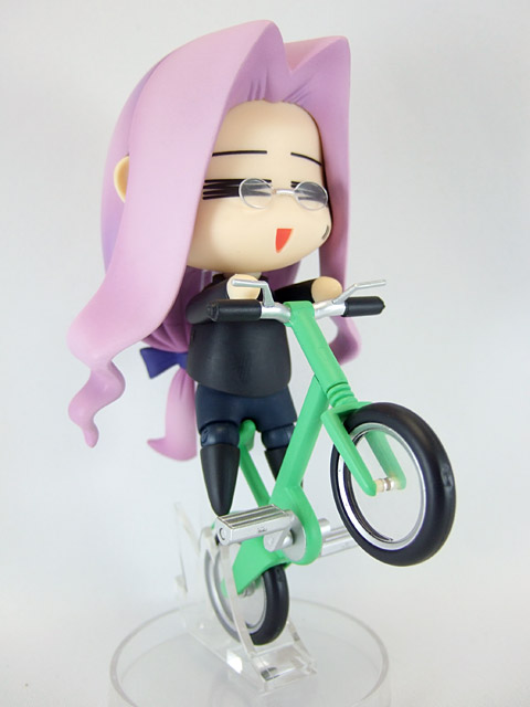 これは、宮沢模型展示会2007年春等でサンプル展示もあった、「Fate/hollow ataraxia」の劇中で登場する、ちゃんりんこにはまったライダーさんを、つくりものじ氏イラストのへたれキャラ姿で立体化したもので、グッスマの商品説明『続々登場のねんどろいどFateシリーズ、続いては「ライダー」を“ちゃりんこ”に乗った姿でユル〜く立体化。つくりものじ氏が描くテイストは健在です。表情は「笑顔」「無表情」「メガネ付き」の3種類。専用台座は2種類の支柱が付属し、自転車に乗ったウイリー状態での展示が可能な優れもの。』と紹介されています。