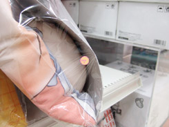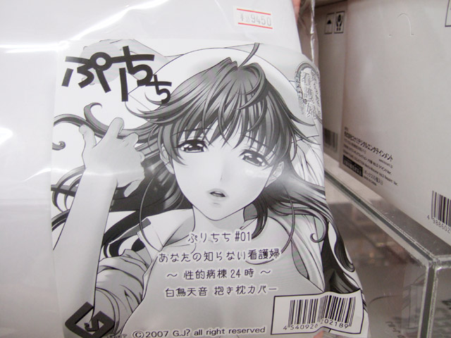 これは、以前サンプル展示もお伝えしたこともある、エロゲ「あなたの知らない看護婦〜性的病棟24時〜」(AA)のキャラ「白鳥天音」を、乳を立体表現し、パンツもめくれる仕様の抱き枕にした「ぷりちち」シリーズ第1弾となるもので、とらの商品説明によると『G.J?の新作PCゲーム『あなたの知らない看護婦〜性的病棟24時〜』から、白鳥天音の等身大おっぱい抱き枕「ぷりちち」がついに登場!! 通常の抱き枕と異なる点は、なんといっても揉んでめくれるという驚愕のギミック!ボリュームたっぷり二つのふくらみは、その確かな手ごたえと柔らかさで夢見心地にしてくれること間違いなしです。 さらに、おっぱいだけでなくパンツにもさらなる欲望を追求!気になる部分はあなたのなすがまま…。 とらのあなでは、王道ともいえる白下着バージョンをご用意。枕本体とのセットもありますので、抱き枕デビューの方でも安心です。佐野俊英先生描き下ろしの白鳥天音を存分にお楽しみ下さい!』と紹介されています。