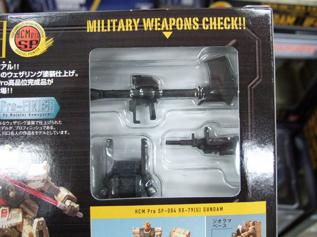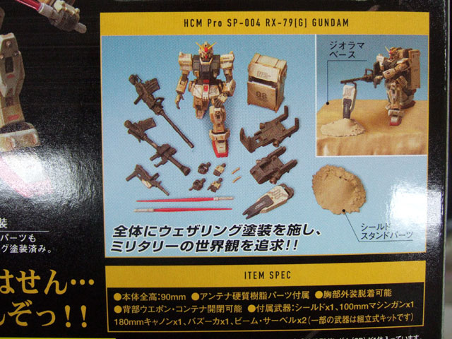 これは、以前サンプル展示をお伝えした、「HCM-Pro38 陸戦型ガンダム」(AA)を、川口克己氏プロデュースのウェザリング塗装仕様にしたもので、Amazonの商品説明によると『HCM-Pro塗装技術の進化!こだわりのウェザリング塗装!川口克己氏プロデュース!全体に精密感を演出するマーキング。ウェザリング塗装済み。シールドを地面に突き刺して立てられるスペシャルパーツ付き。背景を演出する「風景台紙」入り。5面窓のスペシャルパッケージ!』と紹介されています。