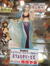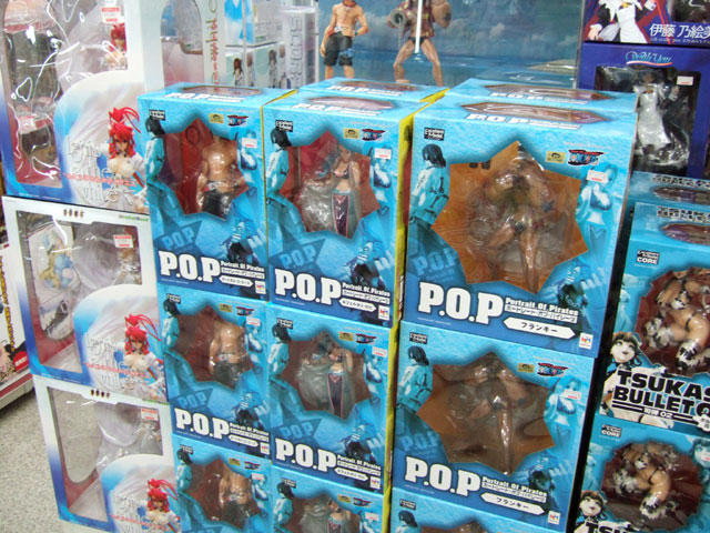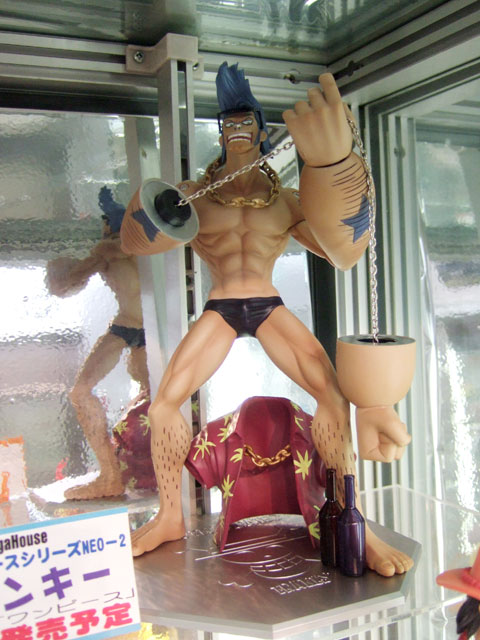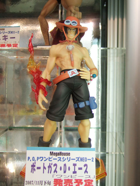 左からそれぞれとらのあな本店での「ポートガス・D・エース」(価格は税込4,200円。)、「フランキー」(価格は税込4,725円。)、「ネフェルタリ・ビビ」(AA)(価格は税込4,200円。)のサンプル展示の様子。