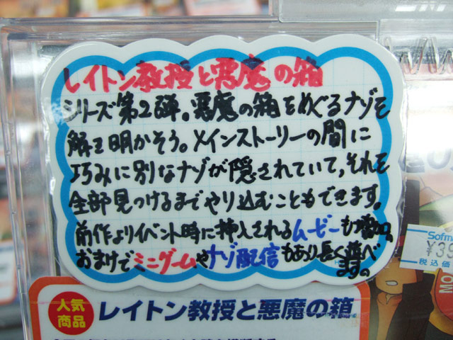 ソフマップアミューズメント館のPOPでは『シリーズ第2弾。悪魔の箱をめぐるナゾを解き明かそう。メインストーリーの間にたくみに別なナゾが隠されていて、それを全部見つけるまでやり込むこともできます。前作よりイベント時に挿入されるムービーも増加。おまけでミニゲームやナゾ配信もあり長く遊べます。』『今回の舞台は町ではなく大陸を横断する長距離列車の中が主な舞台となる。ひとつの町を舞台にした前作とは異なり、本作では列車に乗って複数の町を渡り歩く冒険が描かれている。今作も一筋縄では行かないようです!!今作もDSの機能をフルに生かした画面タッチ!!映画のようなアニメーション!!豪華声優陣も素晴らしい!!ここまで豪華なDSソフトは中々・・・ちなみに担当は前作はすぐにやりませんでした・・・最近やり始めましたが良いです。知らないうちに長時間遊んでますw良いゲームだと思いますよ、はい』とかかれていました。