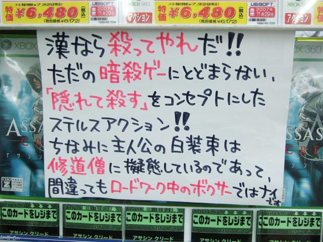 ゲームシティのPOPによると「漢なら殺ってやれだ!!ただの暗殺ゲーにとどまらない、「隠れて殺す」をコンセプトにしたステルスアクション!!ちなみに主人公の白装束は修道僧に擬態しているのであって、間違ってもロードワーク中のボクサーではナイです。」とかかれていました。