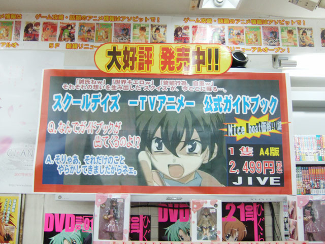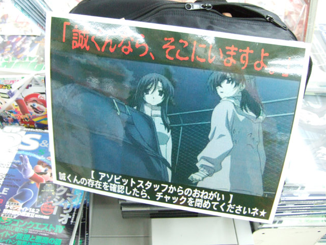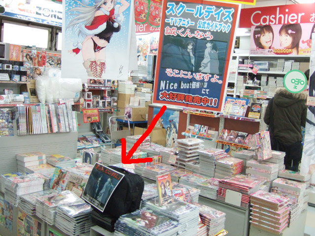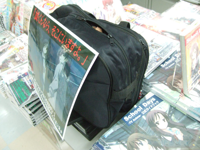 アキバでは数日前から発売されている、「School Days-TV Anime-公式ガイドブック」(AA)が、1日には以前「発売当日は、誠くんにも来てもらう予定ですよ。(意味深)」というPOPを掲示していた、ゲームシティでも入荷していたので売り場で誠くんがきているか確認したところ、売り場にバックが置かれていました。