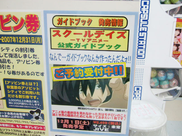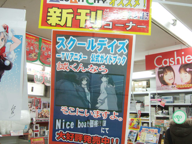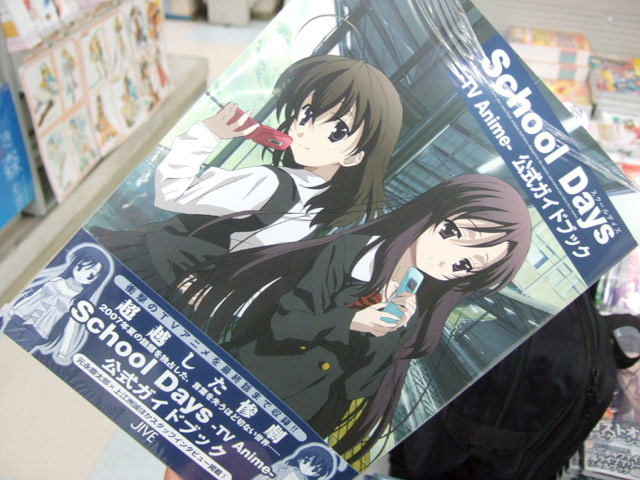 アキバでは数日前から発売されている、「School Days-TV Anime-公式ガイドブック」(AA)が、1日には以前「発売当日は、誠くんにも来てもらう予定ですよ。(意味深)」というPOPを掲示していた、ゲームシティでも入荷していたので売り場を確認したところ、売り場にバックが。そこについた、アニメ最終話の1シーンを用いたPOPによると「誠くんならそこにいますよ。」