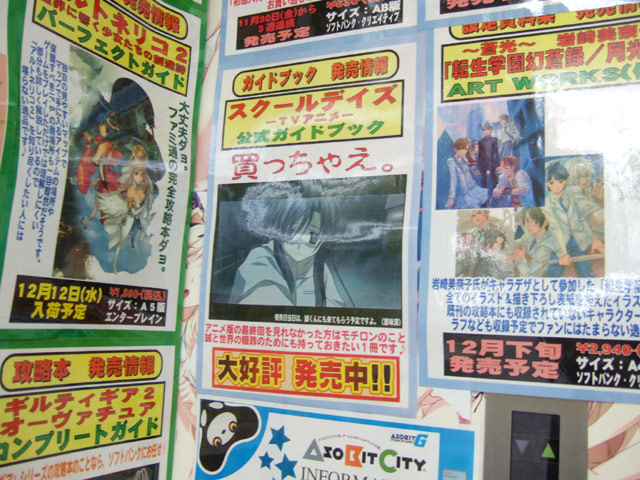 ゲームシティでは他にも、「Q.なんでガイドブックが出てくるのよ!? A.そりゃ、それだけのことやらかしてきましたからネェ。」とか「なんで・・・ガイドブックなんか作ったんだよォ!! アニメ版の最終回を見れなかった方はモチロンのこと誠と世界の賠罪のためにも持っておきたい1冊です♪」の他、以前から掲示されている「買っちゃえ」や5Fトイレにはられた「中に、誰もいませんよ。」など、スクデイPOPが数多く掲示されていました。