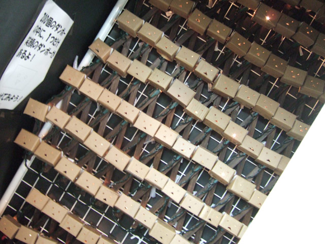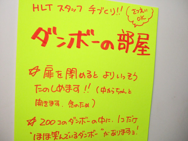 海洋堂ホビーロビーでは「HLTスタック手づくり!! ダンボーの部屋」として、「☆扉を閉めるとよりいっそうたのしめます!!(中からちゃんと開きます。念のため)☆200コのダンボーの中に、1コだけ“ほほ笑んでいるダンボー”がありますヨ!」という、ダンボーの頭がいっぱい展示されている部屋が設けられていました。