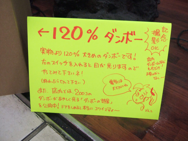 店頭では、「実物より120%大きめのダンボーです!左のスイッチを入れると目が光りますのでやってみて下さいネ!(終わったら切って下さい)」とされた巨大ダンボーも。