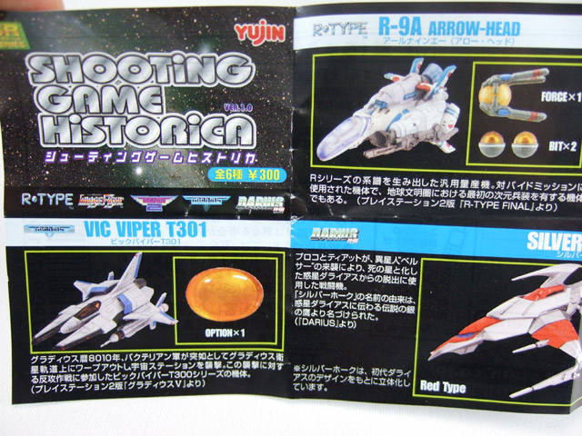 Yujin「シューティングゲームヒストリカ」(RA)は、全長約80�oで、ビックバイパーT301(グラディウスV)、R-9A ARROW-HEAD(R-TYPE FINAL)、OF-1 DAEDALUS(イメージファイト)、メタリオン(グラディウス2)、シルバーホークRED Type/Blue Type(ダライアス)の6種に各スミ入れ有Ver./無Ver.の2タイプで、全12種。
