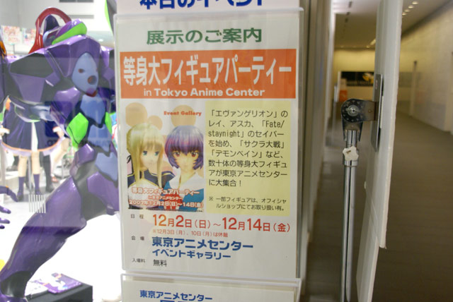 掲示されていたPOPによると『「エヴァンゲリオン」のレイ、アスカ、「Fate/stay night」のセイバーをハジメ、「サクラ大戦」「デモンベイン」など、数十体の等身大フィギュアが東京アニメセンターに大集合!』と謳われていました。