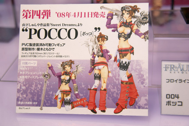 12月1日に開催された、リボルテックエキスポ07では、海洋堂「フロイライン リボルテック 004 ポッコ」のサンプルが展示されていました。これは、山下しゅんや氏の作品集「Sweet Dreams」(AA)に掲載された「POCCO[ポッコ]」をリボルテックフロイライン第4弾として立体化したものです。一瞬可動フィギュアとは思えないくらい、ボディラインが綺麗でした〜w