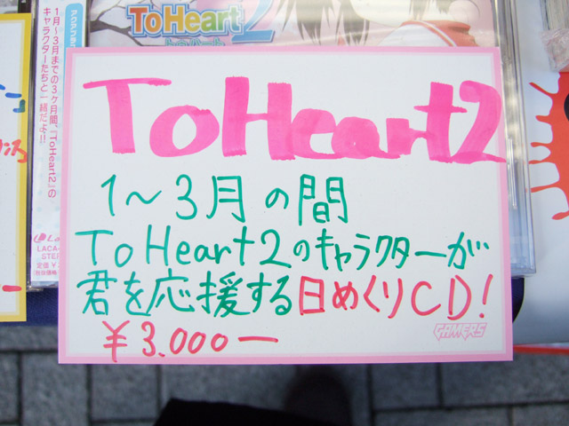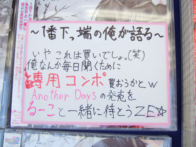 ゲーマーズ本店のPOPでは「ToHeart2 1〜3月の間 ToHeart2のキャラクターが君を応援する日めくりCD!」「〜1番下っ端の俺が語る〜いやこれは買いでしょ(笑)俺なんか毎日聞くために専用コンポ買おうかとw Another Daysの発売をるーこと一緒に待とうZE☆」とかかれていました。