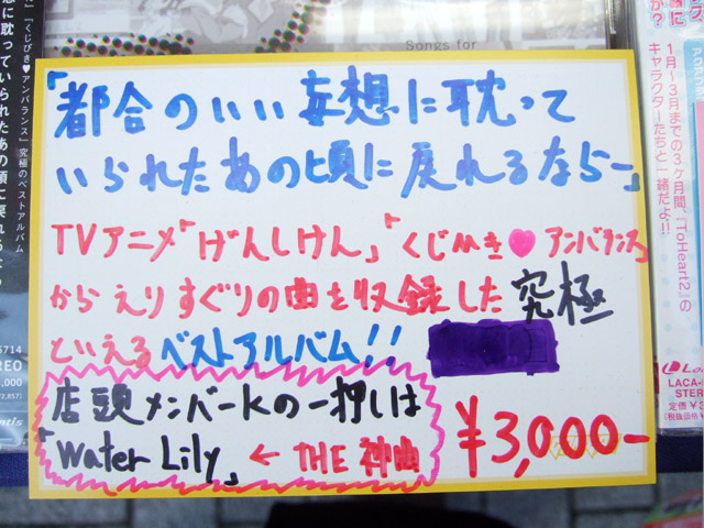 ゲーマーズ本店のPOPでは『「都合のいい妄想に耽っていられたあの頃に戻れるなら-」TVアニメ「げんしけん」「くじびきき;heartsアンバランス」からえりすぐりの曲を収録した究極といえるベストアルバム!!店頭メンバーKの一押しは「WaterLily」←THE 神曲』とかかれていました。