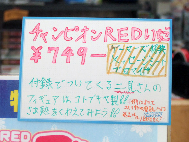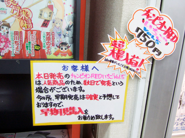 他、5日に入荷確認できたのは、K-BOOKS、「私的には準備OKなポージングにハァハァですヨ。」というPOPのあったゲームシティ、「超大量入荷!お店の倉庫がいちごで占領されるほどに!!! 〜今のところ、早期完売は確実と予想しておりますので、早期購入をお勧め致します。」というPOPのあったとらのあな1号店、メロンブックス、アニメイト等でした。