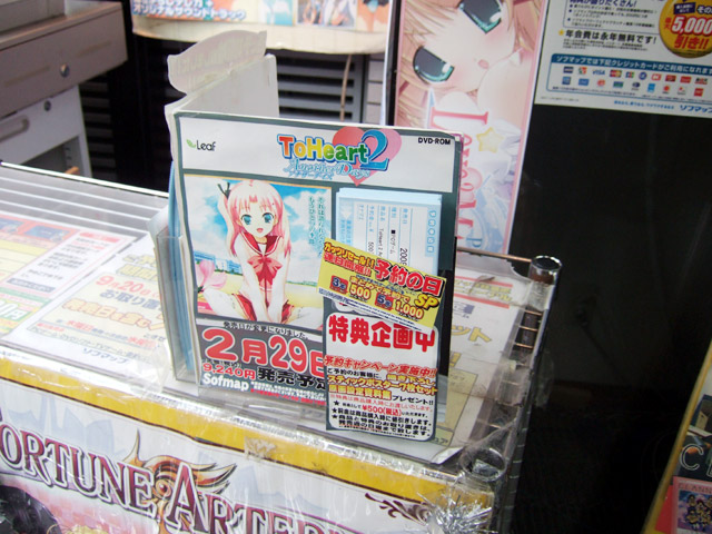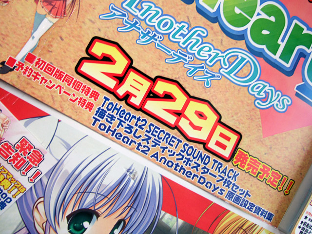 ソフマップ秋葉原PCゲーム・アニメ館にて、以前「さては噂のツンデレだな。」もあった予約開始時には12月24日発売とされていましたが、その後発売日が今冬に延期されていた、Leaf「ToHeart2 AnotherDays」(AA)の発売日を、2008年2月29日と掲示されていました。「ToHeart2 AnotherDays」(AA)は、文字通りToHeart2のアナザーストーリーを収録したエロゲ。