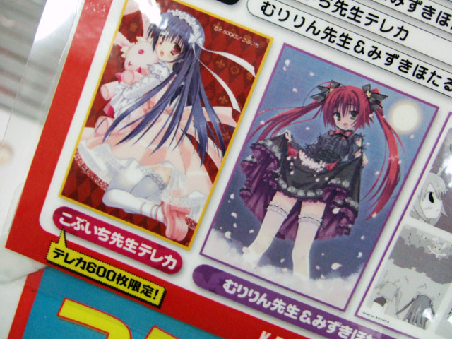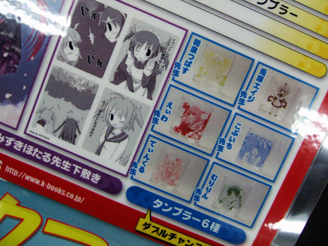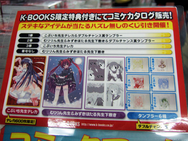 K-BOOKSでは、カタログを購入するとくじが引けて、こぶいち氏テレカ(限定600枚)やむりりん氏、みずきほたる氏のリバーシブル下敷きなどが当たるみたいです。