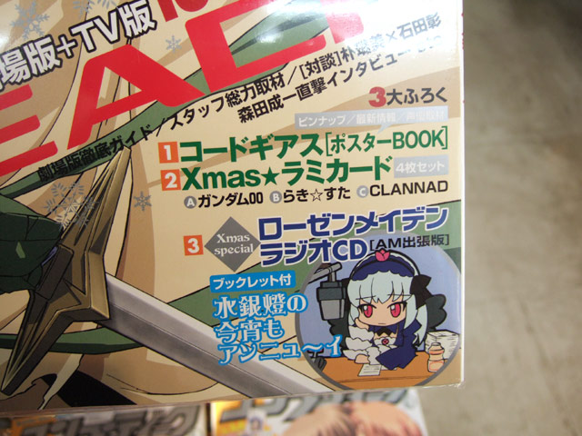 「コードギアス」ポスターBOOK、「ガンダム00」「らき☆すた」「CLANNAD」Xmas★ラミカード、「ローゼンメイデン」ラジオCD(AM出張版)付属。