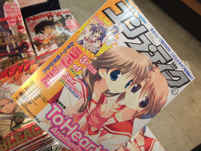 12月10日、「アニメージュ」(AA)、「ニュータイプ」(AA)、「アニメディア」(AA)の2008年1月号が発売されてました。「アニメディア」(AA)には、「なのはシリーズ」の9歳?、15歳?、19歳なのはさんのB2サイズカレンダーが付属するようで、ゲーマーズ本店で、サンプルを展示。他、「コンプティーク」(AA)、電撃hpを引き継いだ「電撃文庫MAGAZINE」(AA)等の、雑誌発売をまとめて。