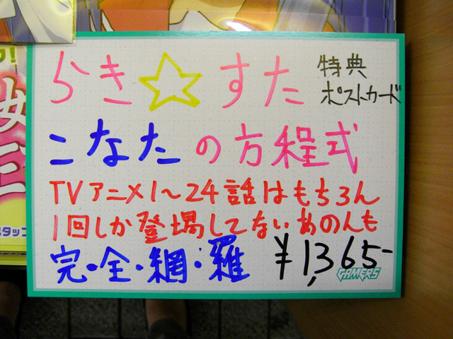 他、ゲーマーズ本店5Fでは「この場にいるお客様 らき☆すた こなたの方程式 買い時です!もう発売してるんだ・・・買わなきゃ」なかがみなどもw